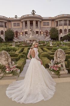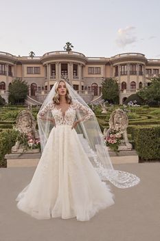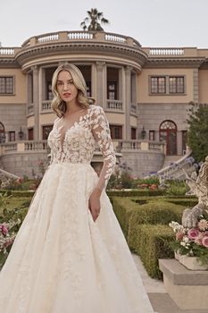 Fall in love all over again with Style 2517 Varley by Casablanca, an elegant sleeved A-line wedding dress crafted from shimmer tulle. An illusion neckline and long sleeves with 3D beaded tulle floral appliques are timelessly beautiful, while a keyhole back ensures an unforgettable appearance as you walk down the aisle. A flowing 70" skirt radiates femininity, and a matching cathedral length veil 2517V is the finishing touch.