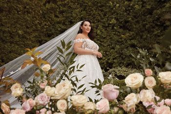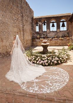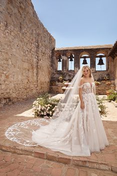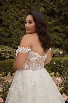 Ethereal Style 2468 Eliana is otherworldly in her effortless grace. Tell your modern love story in this dreamy style, with beaded and sequined 3D floral lace appliques dotting the entire bodice and trailing down the skirt in the most magical way. Tulle all throughout the A-line skirt ensures a lightweight wear, extending into an 86 inch train with horsehair hem decorating the edges. Wear Eliana with or without her optional off-shoulder sleeves, accenting the plunging sweetheart neckline and open back. For an extra whimsical touch, pair her with the matching veil and leave a forever-impact on your spouse-to-be.