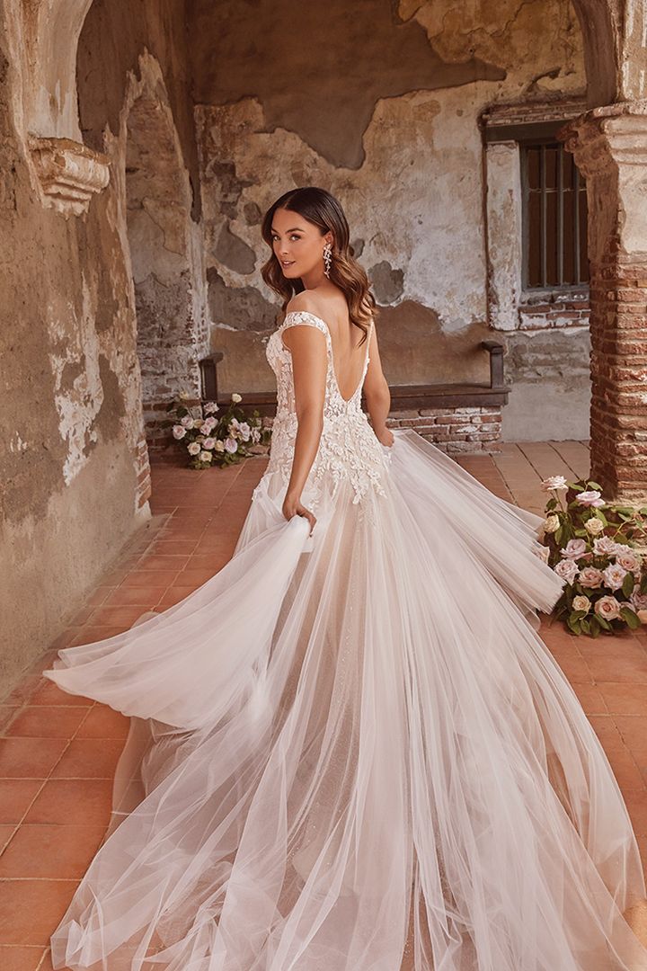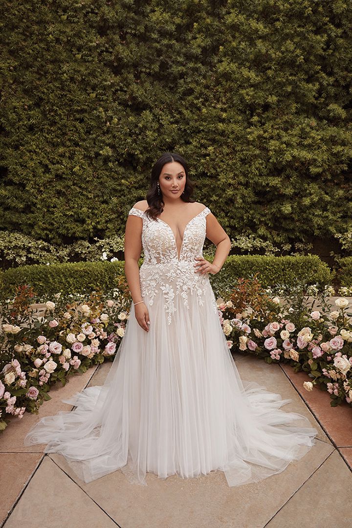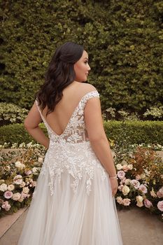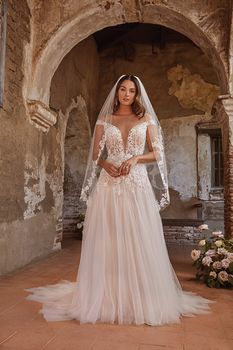Soft and whimsical Style 2469 Lena is the picture of modern grace and poise. This lightweight style is uniquely simple, for the bride who’s looking for a sweet and airy look. The bodice features an illusion neckline that holds up a stunning plunging V-neck and matching V-back. Soft lace appliques travel from the very top of the bodice all the way down past the dropped waist, flowing into an effortless soft tulle skirt with a 73 inch train that will have you floating down the aisle. Stretch lining underneath ensures you’ll be feeling your most comfortable while still looking your most beautiful. A matching veil with lace trim is the perfect accessory to tie this magical look together!