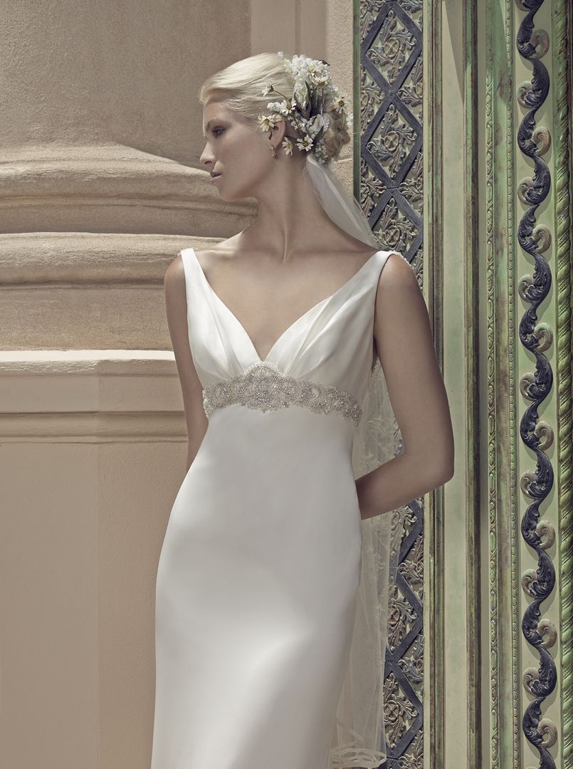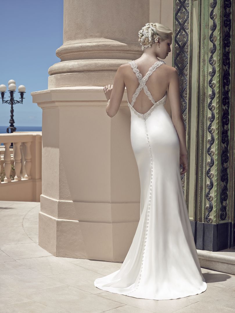 Gowns / Sea Breeze Style 2200 Prev Next Gowns / Sea Breeze Style 2200 The front V-neckline is delicately ruched at the center and adorned with a heavy beaded trim around the entire empire waist. The straps are encrusted with beads and may be worn straight back over the shoulder cris-crossed across the back, attaching with snaps. The Soft Perfecting Satin sheath silhouette finished with matching fabric buttons down the skirt and train. Fabric: Soft Perfecting Satin Available In: Ivory/Silver, White/Silver, Champagne/Silver Shown In: Ivory/Silver Find a Store Share