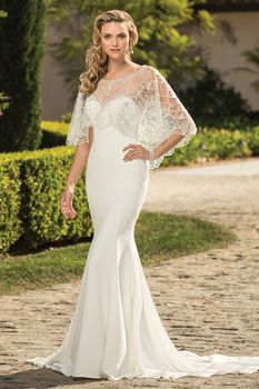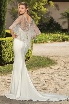 Brides these days continue to trend towards two different looks on their wedding day, which Leona offers an answer for. Don the decoratively beaded cape for the ceremony, then pare down to the simple shape underneath. The high stretch georgette of this fit and flare gown is unimaginably comfortable, and the removable spaghetti straps that can complement the sweetheart neckline bodice offer even more versatility.