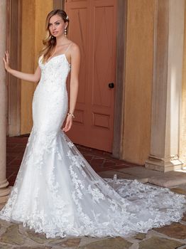 Gowns / Villa Del Sol Style 2313 Marley Prev Next Gowns / Villa Del Sol Style 2313 Marley When it comes to Marley, this lace fit and flare gown is elevated by a touch of drama that extends through the cathedral length train. Delicate Chantilly lace peeks out from below a layer of larger lace appliques, for beautiful texture and contrast. The drama of the train is further enhanced by the low scoop illusion back. Fabric: BLA over Chantilly Lace, Tulle Available In: White/White/White/Silver, Ivory/Ivory/Silver, Light Champagne/Nude/Ivory/Silver, Light Champagne/Ivory/Silver Shown In: Ivory/Ivory/Silver Find a Store Share