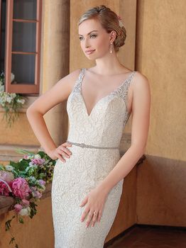 Gowns / Villa Del Sol Style 2319 Niki Prev Next Gowns / Villa Del Sol Style 2319 Niki The re-embroidered lace of Niki creates a slightly dimensional texture that rises off the stretch georgette of this fit and flare gown. The lace straps lead into illusion underarm panels, and the low scoop illusion back is tied off with a beaded ribbon sash for an overall look that is simple and sweet. Fabric: Reembroidered Lace, Stretch Georgette Available In: Light Champagne/Ivory/Silver, White/White/Silver, Ivory/Ivory/Silver Shown In: Light Champagne/Ivory/Silver Find a Store Share