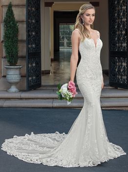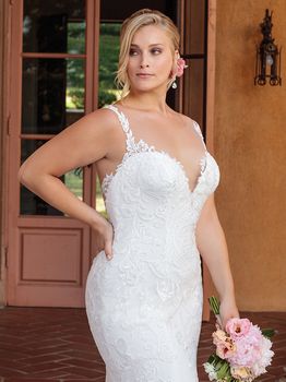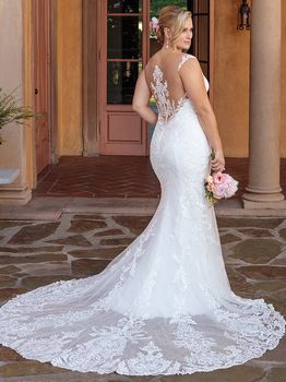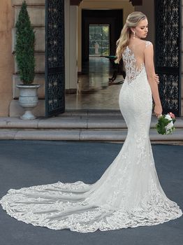 Gowns / Villa Del Sol Style 2328 Kinsley Prev Next Gowns / Villa Del Sol Style 2328 Kinsley A versatile choice for all different styles of brides, Kinsley is a stretch georgette and lace fit and flare gown. Illusion straps and an illusion back highlight the lovely scrolling pattern of the lace appliques, which create a grand finale as they trail down to decorate the cathedral length train. Fabric: Lace, Stretch Georgette Available In: White/White/White, Light Nude/Ivory/Ivory, Ivory/Ivory/Ivory Shown In: Ivory/Ivory/Ivory Find a Store Share